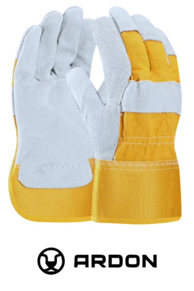 Dlaň rukavíc je vyrobená z hovädzej štiepenky, ktorá poskytuje vysokú odolnosť proti mechanickému poškodeniu, najmä proti oderu a roztrhnutiu. Tento prírodný materiál je známy svojou pevnosťou a dlhou životnosťou, čo z neho robí ideálnu voľbu na ochranu rúk pri manipulácii s rôznymi materiálmi a nástrojmi.
